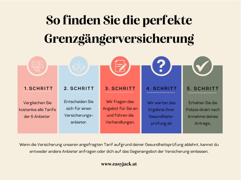 Damit Ihr Start als Grenzgänger reibungslos verläuft, unterstützt Easyjack Sie bei allen administrativen Schritten – von der Krankenversicherung bis zur Steuerberatung. Mehr Details zur besten Grenzgängerversicherung und einen kostenlosen Vergleich aller Versicherungstarife finden Sie hier.